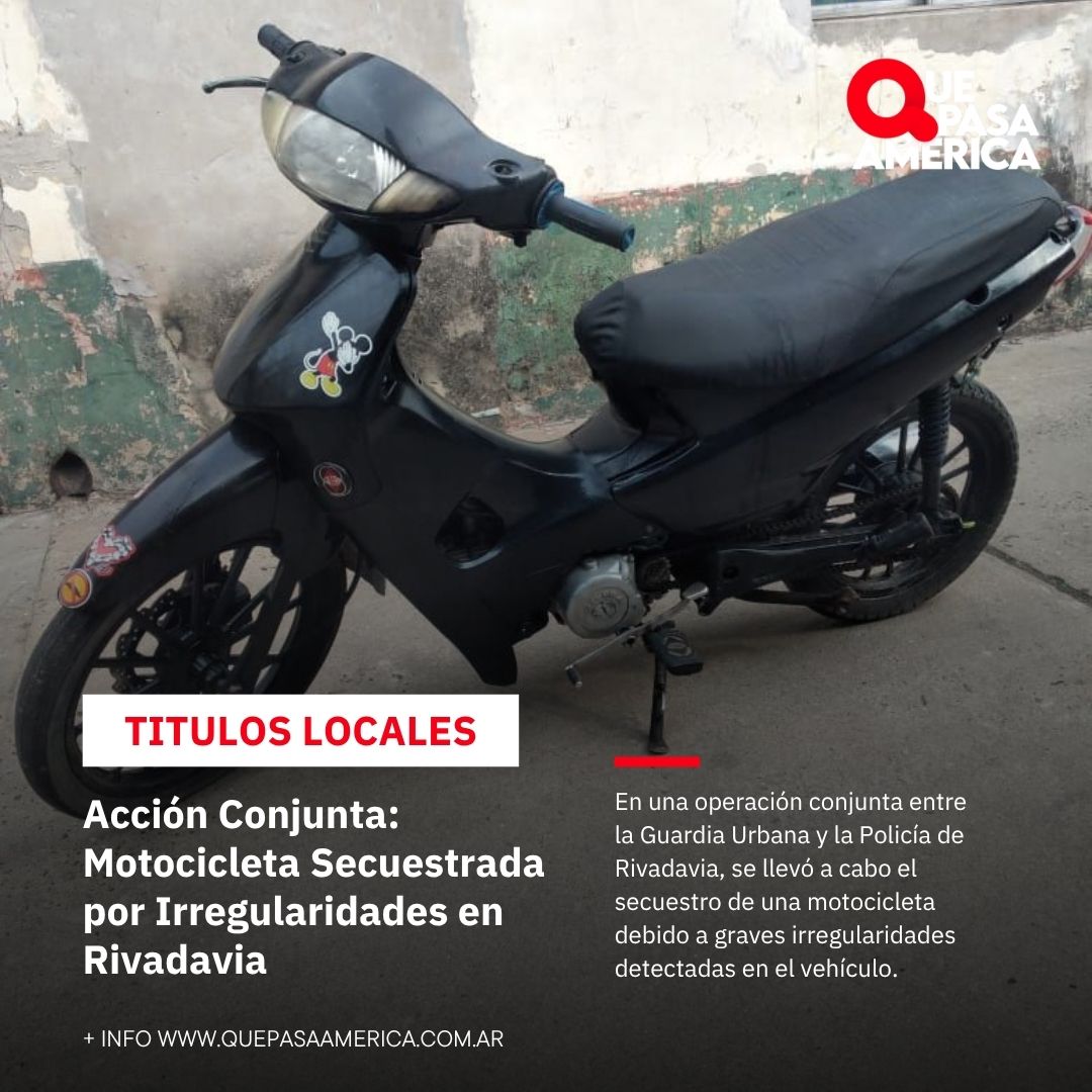 En una operación conjunta entre la Guardia Urbana y la Policía de Rivadavia, se llevó a cabo el secuestro de una motocicleta debido a graves irregularidades detectadas en el vehículo. La acción se realizó tras constatar la falta de dispositivos de seguridad obligatorios y la ausencia de la documentación exigida por la Ley Nacional de Tránsito N.º 24.449.