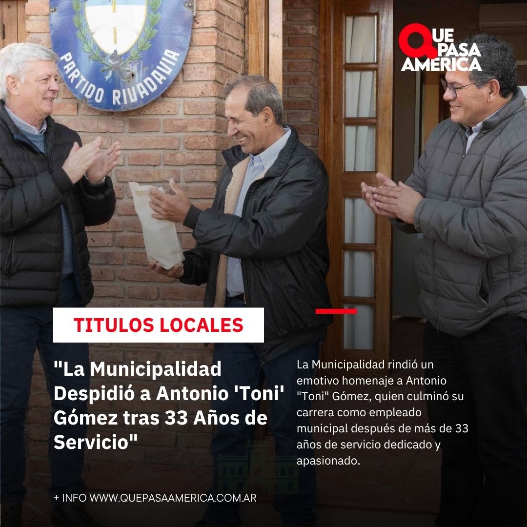 La Municipalidad rindió un emotivo homenaje a Antonio «Toni» Gómez, quien culminó su carrera como empleado municipal después de más de 33 años de servicio dedicado y apasionado. Toni se desempeñó en el área de Servicios Urbanos y, desde 1994, fue chofer de ambulancia en Sansinena, donde se ganó el respeto y la admiración de sus compañeros y la comunidad.
