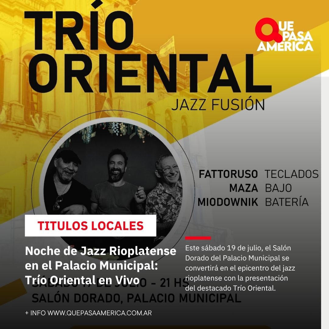 Este sábado 19 de julio, el Salón Dorado del Palacio Municipal se convertirá en el epicentro del jazz rioplatense con la presentación del destacado Trío Oriental. La Dirección de Cultura ofrece a los amantes de la música una noche única y gratuita, donde podrán disfrutar de la maestría y la pasión de Hugo Fattoruso en los teclados, Daniel Maza en el bajo y Fermín Miodownik en la batería.