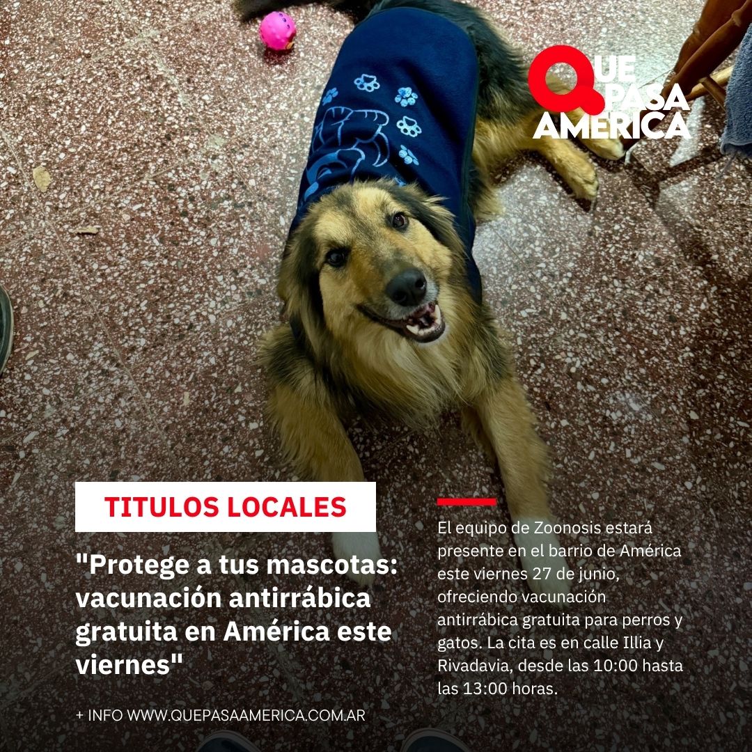 El equipo de Zoonosis estará presente en el barrio de América este viernes 27 de junio, ofreciendo vacunación antirrábica gratuita para perros y gatos. La cita es en calle Illia y Rivadavia, desde las 10:00 hasta las 13:00 horas.