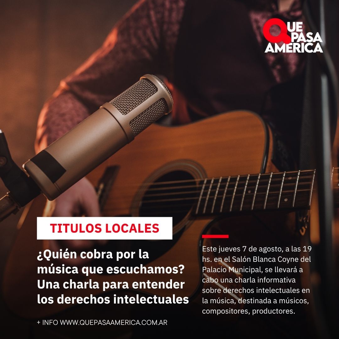 Este jueves 7 de agosto, a las 19 hs. en el Salón Blanca Coyne del Palacio Municipal, se llevará a cabo una charla informativa sobre derechos intelectuales en la música, destinada a músicos, compositores, productores y cualquier persona interesada en entender cómo funciona el sistema que regula y distribuye el dinero que genera la música.