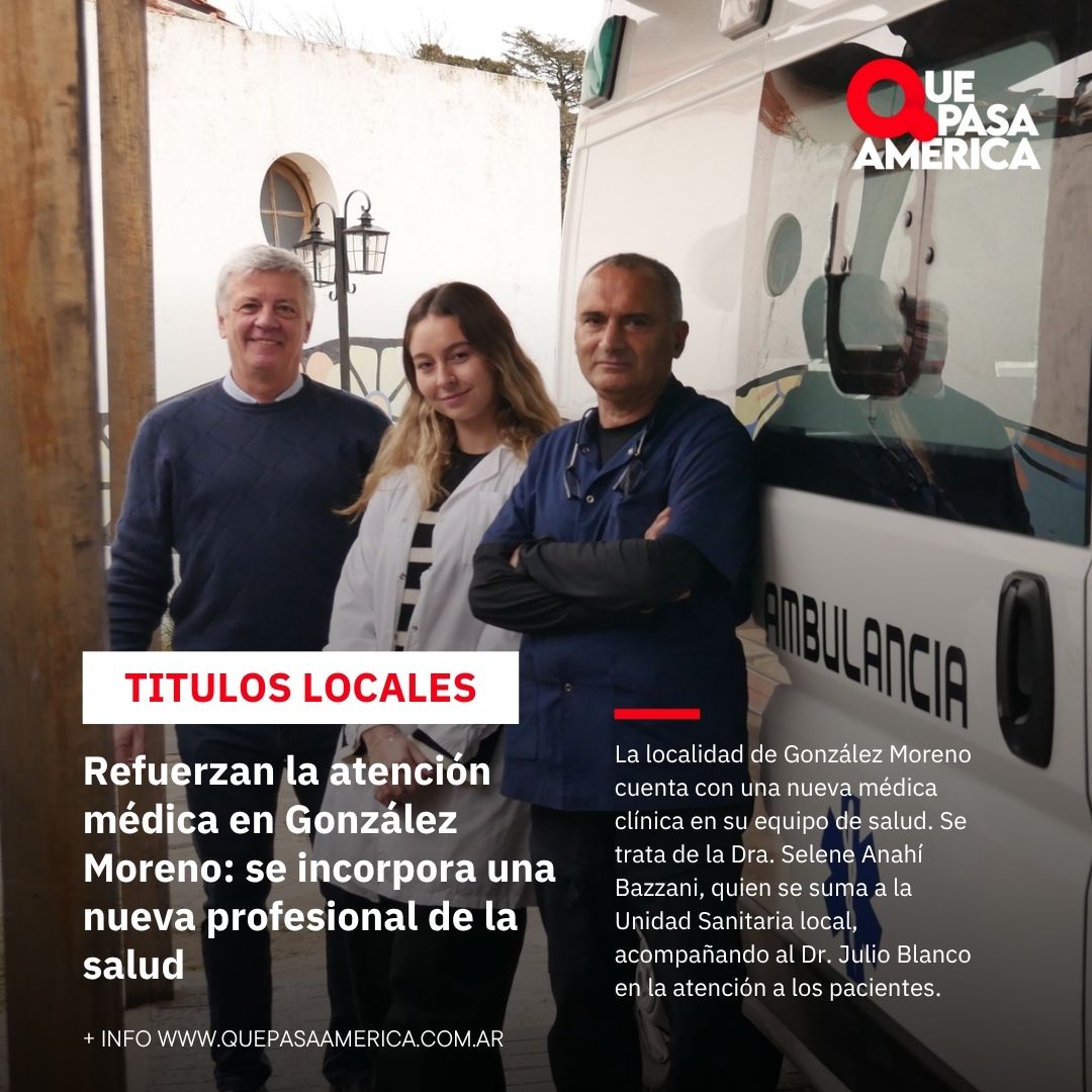 La localidad de González Moreno cuenta con una nueva médica clínica en su equipo de salud. Se trata de la Dra. Selene Anahí Bazzani, quien se suma a la Unidad Sanitaria local, acompañando al Dr. Julio Blanco en la atención a los pacientes.