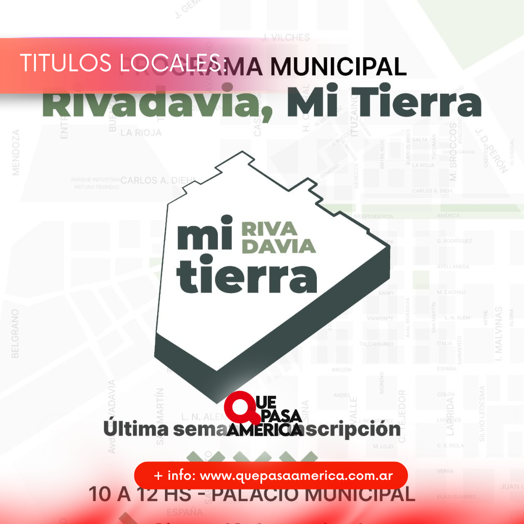 El Municipio de Rivadavia recordó que se encuentra en su última semana la inscripción al programa “Rivadavia, Mi Tierra”, una iniciativa destinada a vecinos del distrito interesados en acceder a lotes municipales.