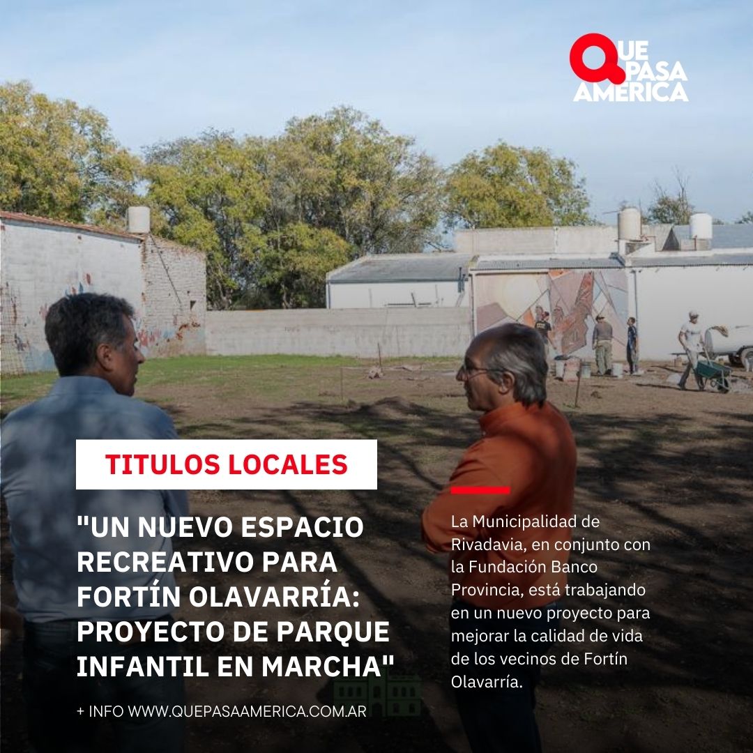 La Municipalidad de Rivadavia, en conjunto con la Fundación Banco Provincia, está trabajando en un nuevo proyecto para mejorar la calidad de vida de los vecinos de Fortín Olavarría. El intendente Juanci Martínez, junto con el delegado Héctor Raúl Echeverría, el secretario de Gobierno Sebastián Hernández y la arquitecta Micaela Hernández, visitaron el terreno donde se construirá un nuevo Parque Infantil.