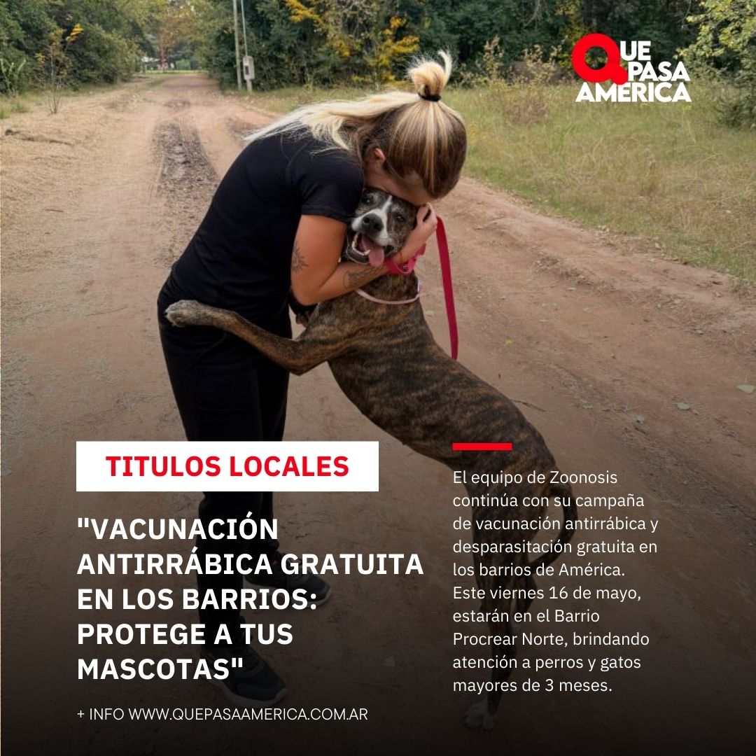 El equipo de Zoonosis continúa con su campaña de vacunación antirrábica y desparasitación gratuita en los barrios de América. Este viernes 16 de mayo, estarán en el Barrio Procrear Norte, brindando atención a perros y gatos mayores de 3 meses.