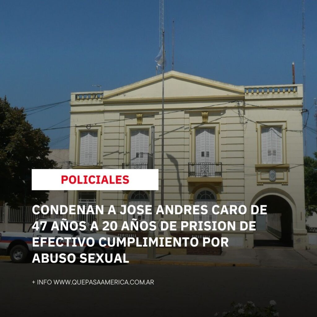 CONDENA: La Jefatura Departamental de Rivadavia informa que el día 26/03/2025 se dio a conocer la Condena en la CAUSA Nº 379-4003 donde el Tribunal Criminal N° 01 y el arduo trabajo del Fiscal Penal Dr. Leandro Cortellezzi perteneciente a la UFI N° 1 de Trenque Lauquen y el trabajo del personal policial y Equipo de la Comisaria de la Mujer y Familia de Rivadavia donde se inició primeramente la presente llevaron a la condena de JOSÉ ANDRÉS CARO (47 años), donde S.S lo consideraron autor penalmente responsable de los delitos de ABUSO SEXUAL CON ACCESO CARNAL, REITERADOS -AL MENOS 4 HECHOS- EN CONCURSO REAL (arts. 119 tercer párrafo y 55 del C.P.), cometidos entre el año 2010 y el año 202 en la localidad de América, pdo. de Rivadavia, a quien se le dio la pena de VEINTE (20) AÑOS DE PRISIÓN DE EFECTIVO CUMPLIMIENTO.-