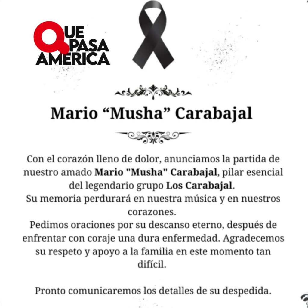 En un comunicado que difundieron hoy los integrantes del grupo Los Carabajal, se anunció la muerte del cantante, guitarrista y autor Mario “Musha” Carabajal, de 72 años, quien había sido el líder de este grupo clave en la historia del folklore. “Su memoria perdurará en nuestra música y en nuestros corazones. Pedimos oraciones por su descanso eterno, después de enfrentar con coraje una dura enfermedad. Agradecemos su respeto y apoyo a la familia en este momento tan difícil”, señala el comunicado que hicieron circular por las redes sociales.