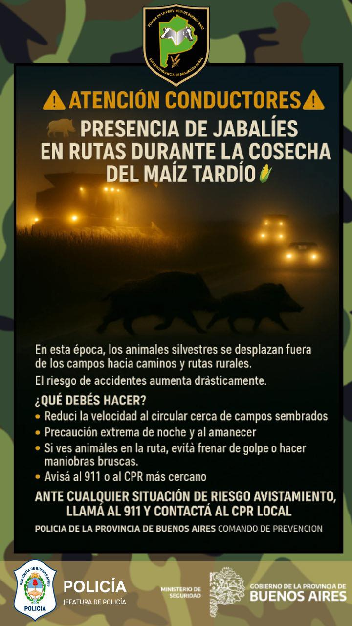 Además, desde hace unos días el Comando de Prevención Rural de la Policía Bonaerense alertó sobre la presencia de jabalíes en rutas durante la cosecha de maíz tardío, lo que incrementa el riesgo de accidentes.