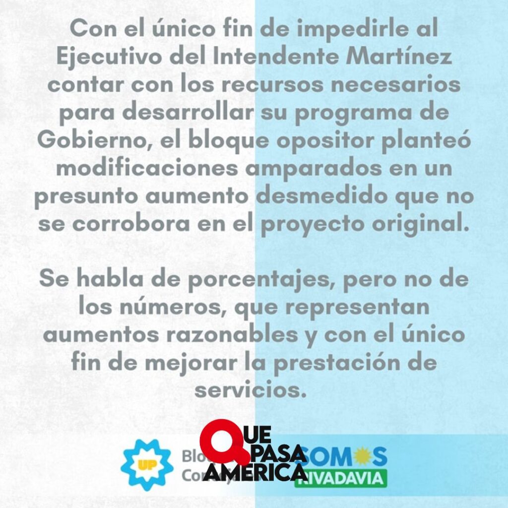 Desde el oficialismo acusan a la oposición de instalar el discurso falso de un supuesto «impuestazo». Por su parte Rivadavia Primero acepto aprobar la Fiscal e Impositiva solo con reformas que ellos consideraban fundamentales para el acuerdo.