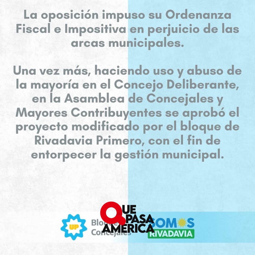 Desde el oficialismo acusan a la oposición de instalar el discurso falso de un supuesto «impuestazo». Por su parte Rivadavia Primero acepto aprobar la Fiscal e Impositiva solo con reformas que ellos consideraban fundamentales para el acuerdo.